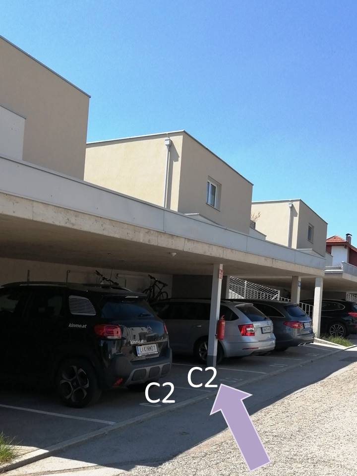 Sie können Ihr Auto im Carport mit Bodenzeichen C2 abstellen. Weitere Parkplätze finden Sie in der Grundstraße.